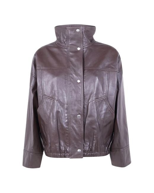 Marrón tierra cuello alto cierre de botón dobladillo elástico bolsillos en el pecho diseño de paneles Size: 40. Gender: Female. Material:Piel de becerro. Color: morado