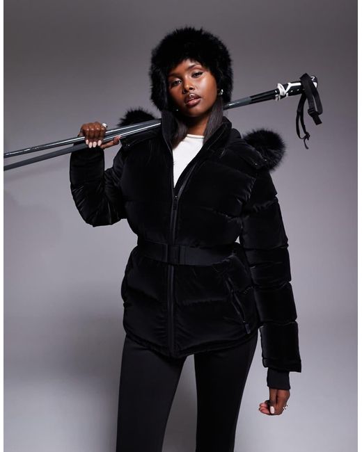 - Chaqueta De Esquí Negra Brillante Acolchada Con Ribete De Piel Sintética En La Capucha De Ski