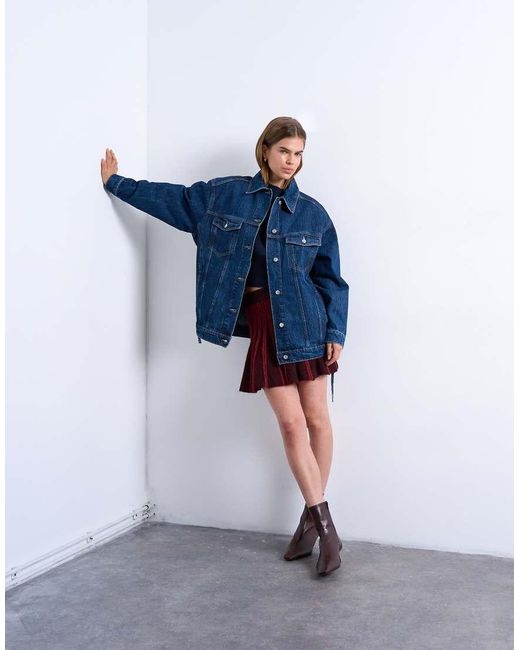 Abrigos y chaquetas de Topshop Esta chaqueta está confeccionada con un tejido denim no elástico con un lavado azul oscuro. Cuenta con una tapeta de botones, bolsillos en el pecho, un cinturón en la cintura y un corte extragrande. Color: azul