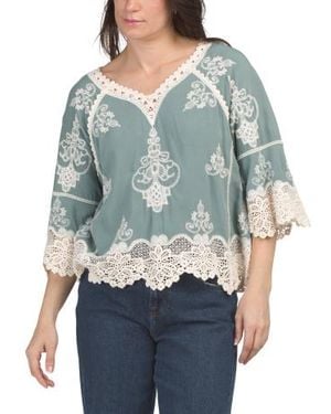 Puff Sleeve Crochet Top With Contrast Lace Trim For - White