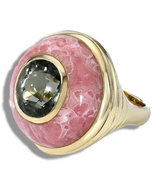 Green Tourmaline In Rhodochrosite Petite Lollipop Yellow Gold Ring - Pink