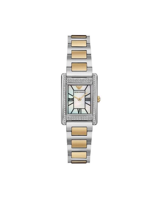 Boîtier de 22 mm x 32 mm, largeur de bracelet de 16 mm, cristal minéral, mouvement à quartz avec affichage analogique à deux aiguilles, importé Boîtier rectangulaire en acier inoxydable, cadran en nacre blanche Bracelet en acier inoxydable bicolore Étanchéité jusqu'à 50 m : adaptée à la nage en eaux peu profondes. Coloris : métallisé