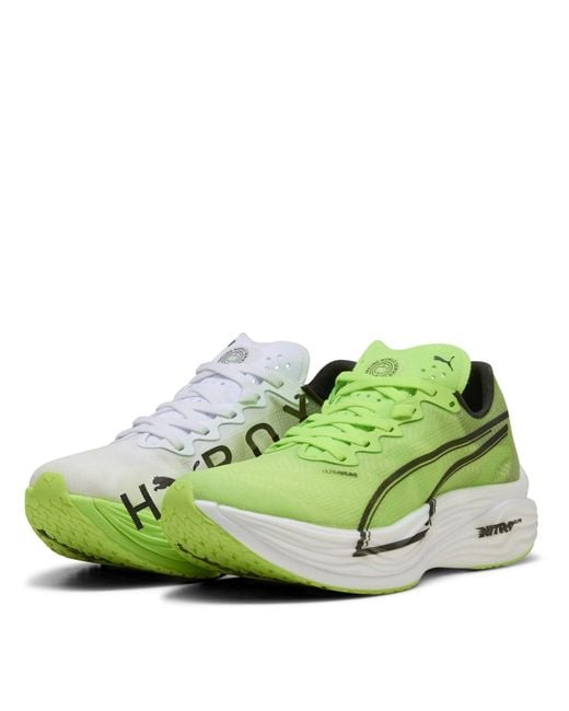 Histoire du produit : Turbochargez votre course avec les dernières nouveautés de Puma Doté d'un rembourrage NITROFOAM ELITE d'une plaque PWRPLATE en carbone pour la propulsion d'élite et de PUMAGRIP pour une traction multi-surfaces La tige ULTRAWEAVE assure une respirabilité légère tandis que la chute du talon aux orteils de 8 mm vous permet d'avancer Prêt à l'emploi. Caractéristiques et avantages : plaque en fibre de carbone conçue pour stabiliser la semelle intermédiaire tout en maximisant le transfert d'énergie. NITROFOAM Elite : technologie de mousse haute performance qui offre une réactivité maximale dans un emballage extrêmement léger. PWRTAPE : renfort supérieur ciblé pour plus de soutien et de durabilité Détails : largeur normale. Dessus en textile. Fermeture à lacets. Hauteur du talon aux orteils : 8 mm. Poids de la chaussure : 164,25 g. Recommandé pour : pronateurs neutres. Détails de la marque PUMA : Informations sur le matériau : semelle intermédiaire : 100 % synthétique. Semelle intérieure : 100 % textile. Semelle extérieure : 87 % caoutchouc, 13 % synthétique. Dessus : 82 % textile, 18 % synthétique. Ing : 100 % Textile. Coloris : vert