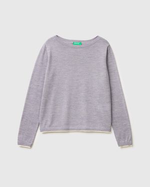 Benetton, Pull À Col Bateau 100% Laine Mérinos, Taille, Gris Clair, Femme - Noir