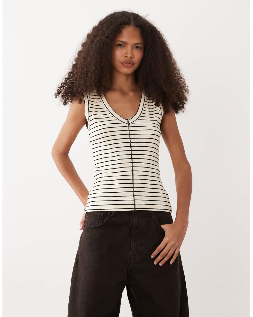 Débardeur côtelé épais à col v et coutures visibles - crème et noir rayé