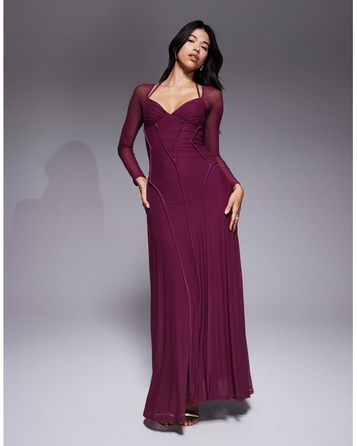 Robe longue en tulle à manches longues à coutures apparentes - prune profond femme de coloris violet