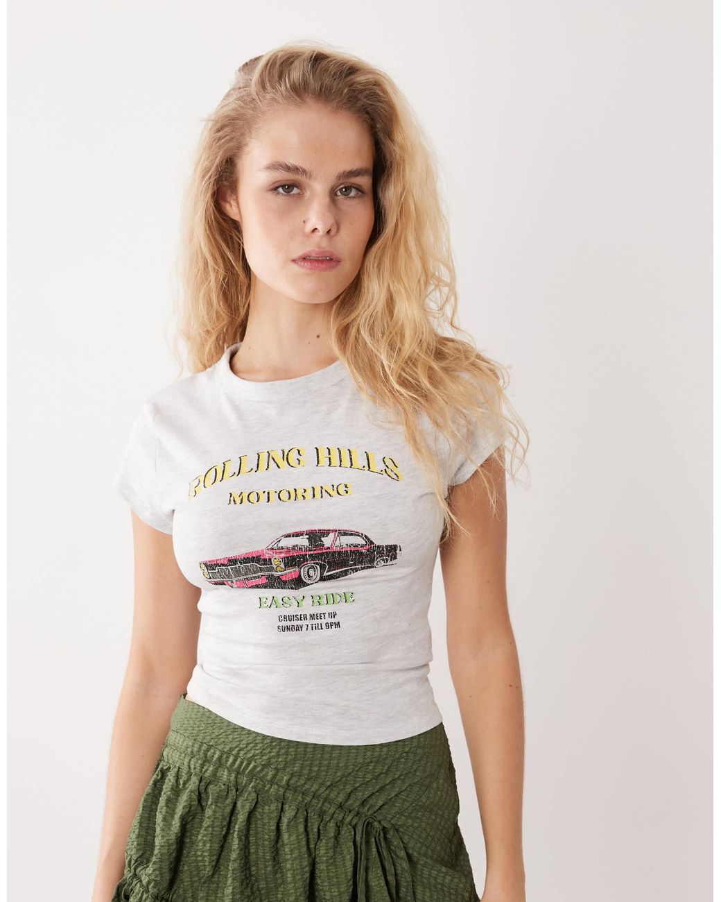 T-shirt effet rétréci à manches courtes avec imprimé voiture style vintage - chiné femme de coloris blanc
