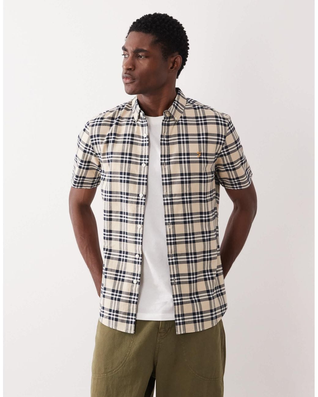 Chemises par Farah Col boutonné Patte de boutonnage Manches courtes Motif à carreaux Broderie sur la poitrine Ourlet arrondi Coupe classique. Coloris : gris
