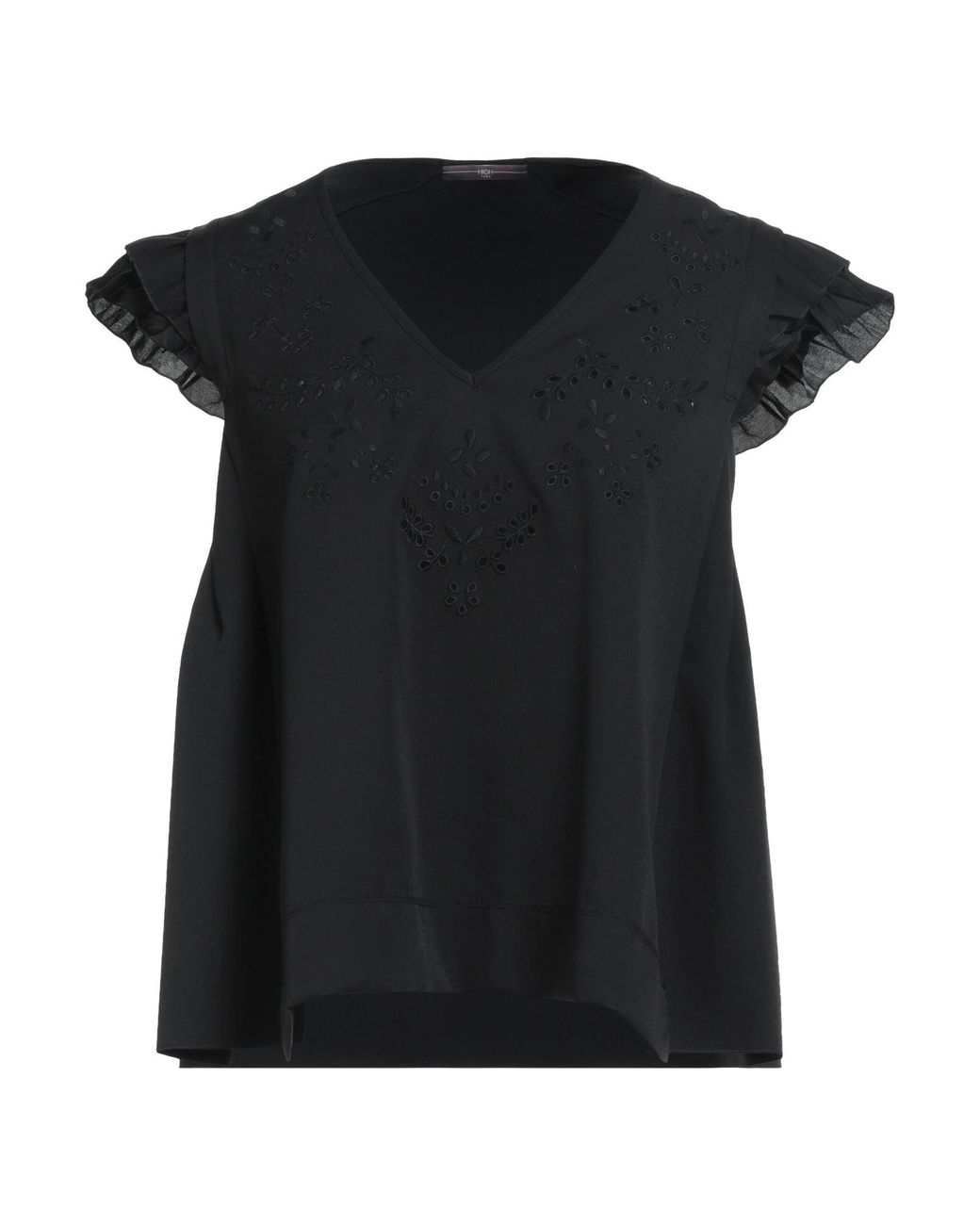 HIGH. top, toile, uni, brodé, col en v, manches courtes, manches à ailette, bas avec fentes latérales, tissu élastique. 95% Polyester, 5% Élasthanne.