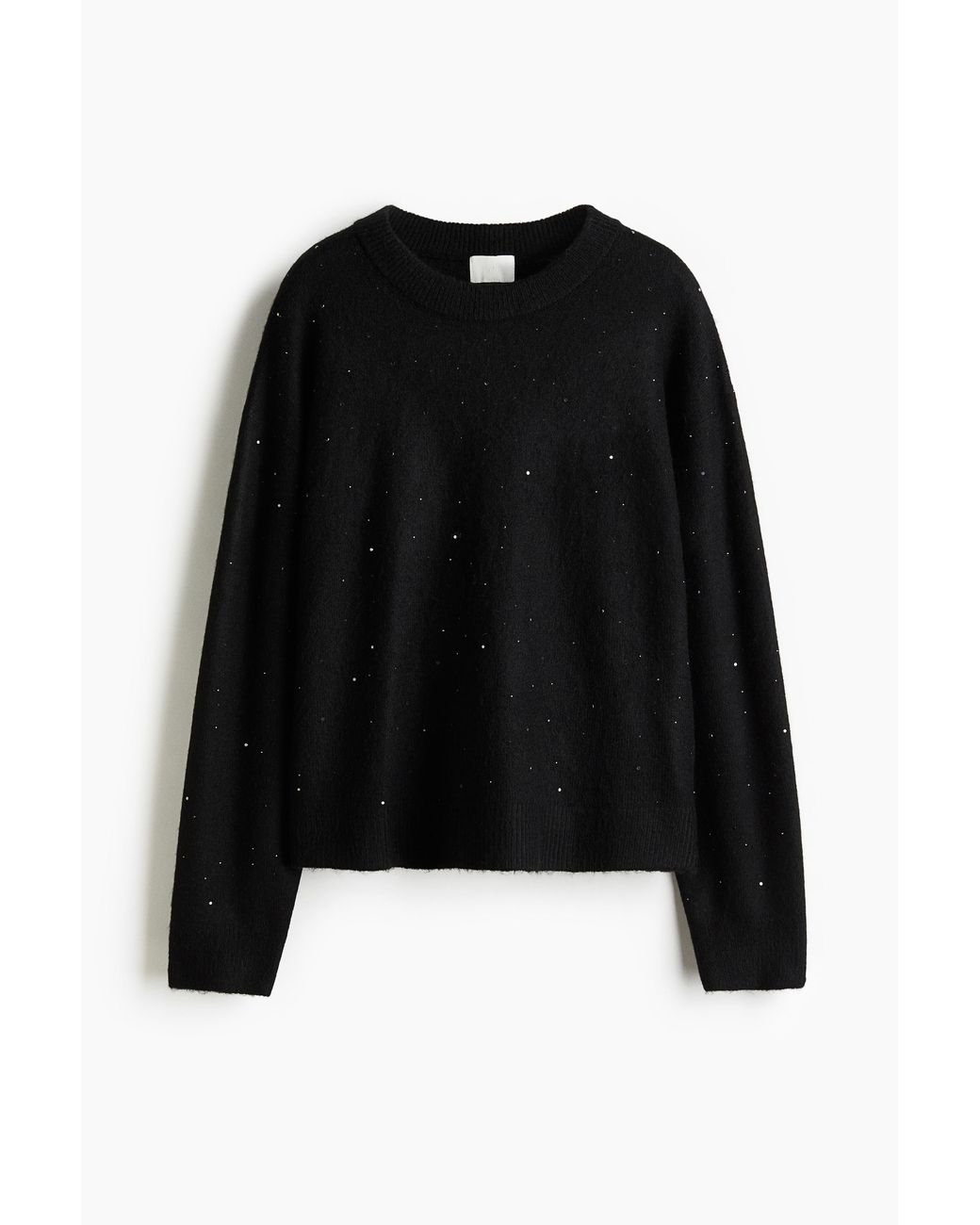 Pull en maille douce avec ornementations. Modèle oversize avec bande côtelée autour de l'encolure ronde, emmanchures descendues et manches longues. Finition côtelée aux poignets et à la base. Coloris : noir