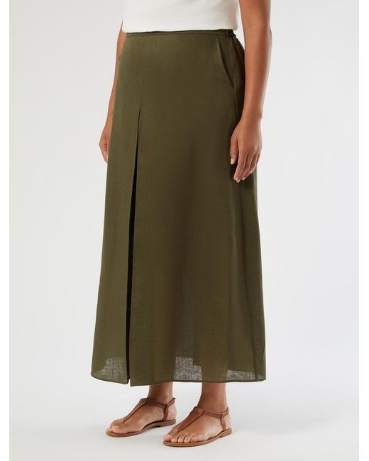 Ligne évasée et tissu naturel pour cette jupe en lin, avec fermeture zippée invisible sur le côté et élastique à la taille. Un vêtement polyvalent et raffiné pour le quotidien, que vous pouvez combiner avec la veste assortie. L'article fait partie de la collection Persona by Marina Rinaldi. Lin Ligne évasée Détail élastique à la taille Fermeture zippée invisible et crochet sur le côté Pli creux devant et au dos Poches italiennes sur les côtés Coloris : vert