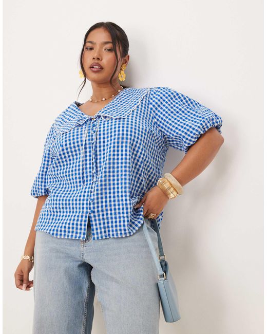 - Birdie - top à col et manches bouffantes - vichy bleu