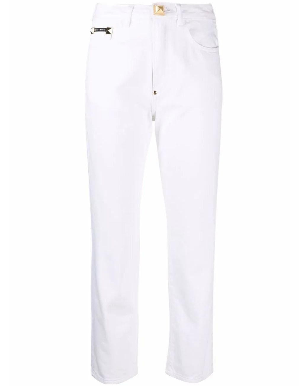 Coupe boyfriend, détails de clous pointus, patch logo sur le devant, passants de ceinture, fermeture à zip et boutons sur le devant, cinq poches classiques. Couleur : blanc. Matière : coton. Size: 27. Gender: Female. Material:coton/coton/polyester/cuir de veau. Coloris : blanc