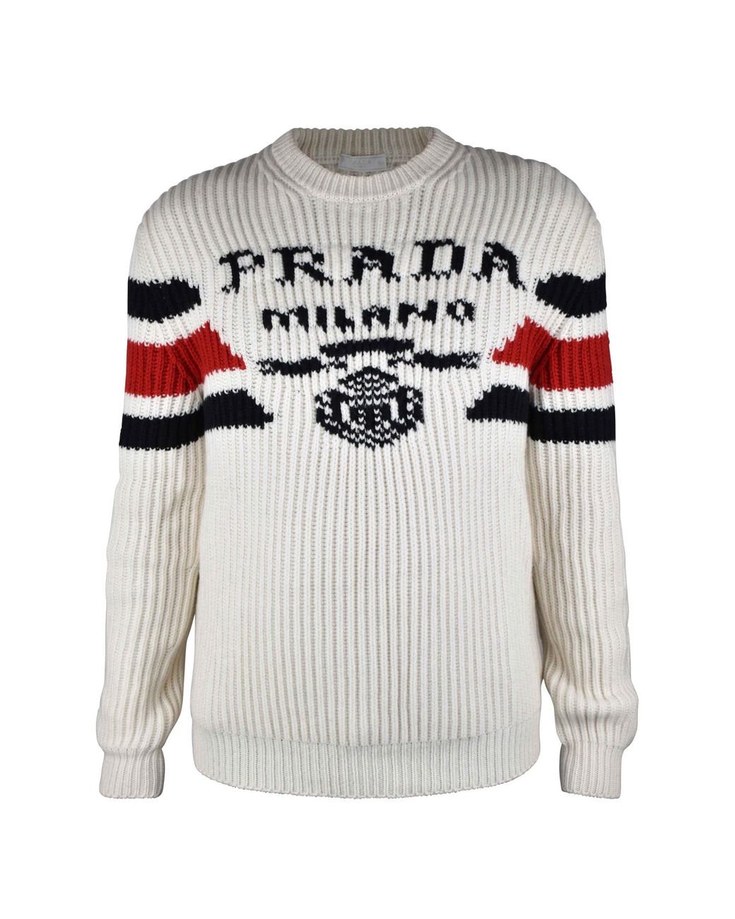 Pull Prada en cachemire blanc. Logo rouge et noir horizontal sur la poitrine. Encolure ras du cou. Bords côtelés. Manches longues. 100% cachemire. Coloris : blanc