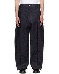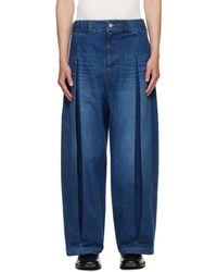 Consulter SSENSEJean en denim non extensible. · Taille élastique · Trois poches · Braguette à glissière · Plis creux à l'avant · Piqures contrastantes brun clair Couleur du fournisseur: Raw denim Coloris : bleu