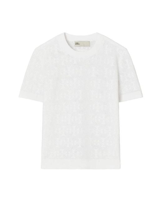Le t-shirt en maille perforée Tory Burch est doté d'un tissu en maille respirant et de détails perforés complexes, offrant un haut de tous les jours raffiné qui se porte aussi bien seul que superposé. Caractéristiques principales : Blanc | Maille | Respirant | Superposable | Détails perforés | Texture maille Coloris : blanc