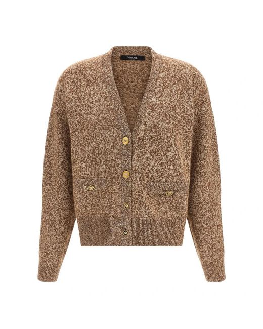 Promos exclusives ! Gilet boxy Versace En Maille Mélange Cachemire Moulin avec bouton en métal signature Medusa 95. Un gilet boxy à col en V çu pour une superposition décontractée et un usage quotidien. Caractéristiques principales : Beige | Mélange de laine et de cachemire mouliné | Fermeture boutonnée en métal sur le devant | Poches | Col en V | Manches longues poignets | Épaules tombantes | Détail bouton en métal Medusa 95 | Dimensions et coupe : Coupe boxy | Épaules tombantes | Composition et entretien : 56 % laine vierge | 24 % cachemire | 20 % soie Coloris : marron
