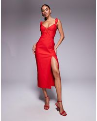 Vesper Robe longueur mollet à fines bretelles et corsage froncé en bengaline femme de coloris rouge