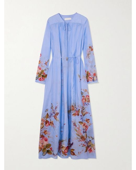 Robe Longue En Soie À Imprimé Fleuri Et À Fronces Patience femme de coloris bleu