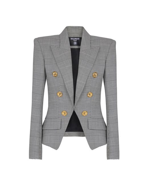 La giacca a 6 bottoni Balmain in jacquard Principe di Galles unisce una silhouette strutturata e sartoriale al classico motivo Principe di Galles, ideale per occasioni formali ed eleganti ma anche smart-casual. Caratteristiche principali: Nero | Lana vergine | Tasche laterali a filetto con patta | Polsini con bottoni | Chiusura senza colletto con bottoni 'Filo da cucito' | Collo sartoriale italiano | Maniche lunghe | Spalle strutturate | Motivo jacquard Principe di Galles | Chiusura frontale a 6 bottoni | Dimensioni e vestibilità: Vestibilità sartoriale | La modella misura 175 cm e indossa una taglia 36 | Composizione e cura: 95% lana vergine | 4% poliammide | 1% elastan | Si raccomanda il lavaggio a secco professionale. Proteggere le parti metalliche prima del lavaggio. Appendere su una gruccia tra un utilizzo e l'altro e conservare in una custodia al riparo dalla luce. Colore: grigio