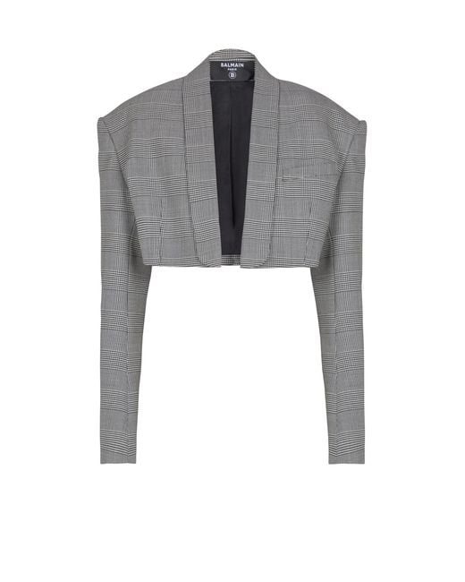 <p>Giacca spencer in jacquard Principe di Galles</p><ul><li>Collo sartoriale italiano</li><li>Maniche lunghe</li><li>Spalle strutturate</li><li>Polsini con bottoni rivestiti</li><li>Tasca sul petto</li><li>Vestibilità corta e dritta</li><li>La persona nella foto è alta 175 cm e indossa una taglia 36</li><li>Materiali principali: 95% lana vergine 4% poliammide 1% elastan</li><li>Articolo fabbricato in Portogallo</li><li>Articolo: GF1SD260WD31</li></ul><p>Il 100% delle fibre di lana di questo capo proviene da allevamenti di pecore rispettosi del benessere degli animali e certificati</p> Colore: grigio