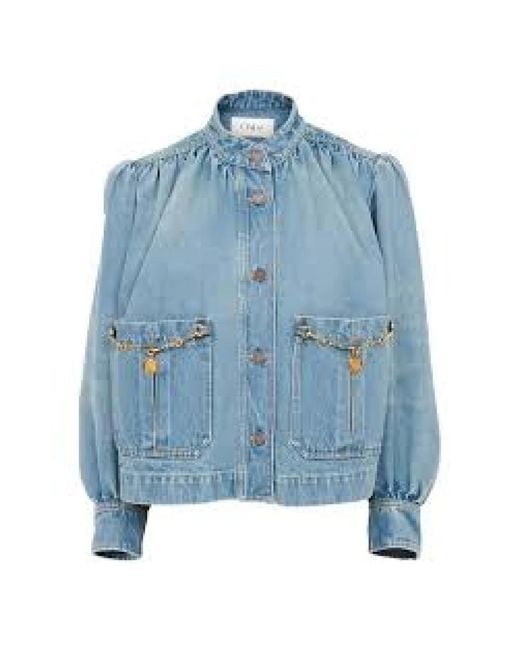 La giacca arricciata a collo alto di Chloé combina il denim strutturato con spalle arricciate e maniche a sbuffo per un capo spalla raffinato e contemporaneo. È progettata come un pezzo forte con catene decorative sulle tasche e bottoni firmati con incisione. Caratteristiche principali: Blu | Blau | Cotone | Denim non elasticizzato | Peso medio | Chiusura con bottoni sul davanti | Polsini con bottoni | Due tasche applicate sul davanti | Collo alto | Spalle arricciate | Maniche a sbuffo | Tasche applicate con catena decorativa in ottone dorato con medaglia Horse | Bottoni in jeans con incisione Chloé | Dimensioni e vestibilità: Vestibilità dritta | Composizione e cura: 100% cotone | Lavare in lavatrice a freddo (max 30°C) con ciclo delicato; non candeggiare; stirare a bassa temperatura (max 110°C); non asciugare in asciugatrice; si raccomanda il lavaggio a secco delicato professionale (tetracloroetilene); non lavare a umido. Colore: blu