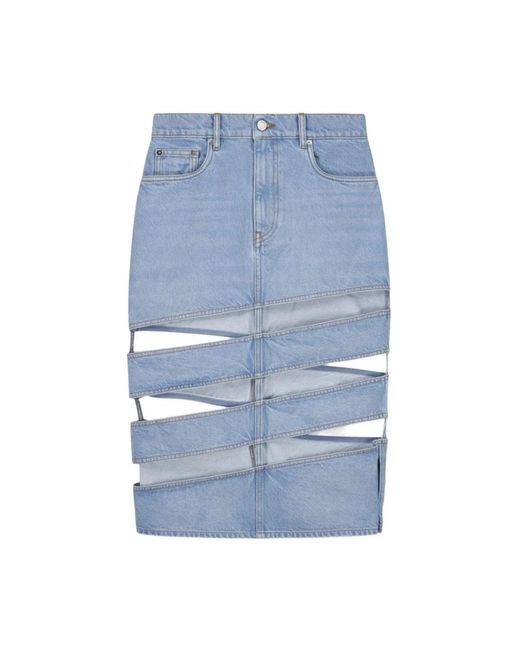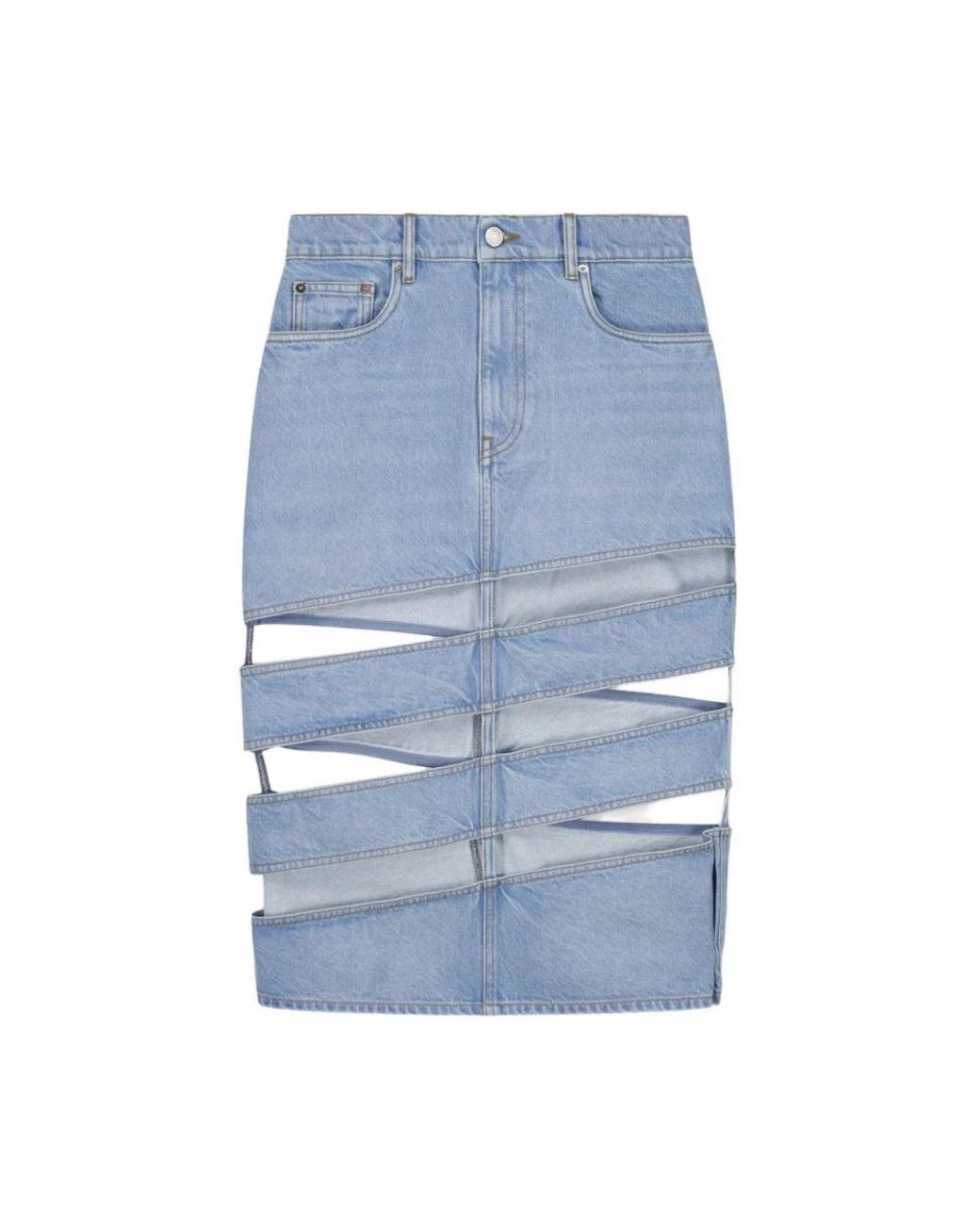 Gonna in denim blu slavato di Coperni, caratterizzata da un moderno effetto avvolgente e una cintura asimmetrica, per un look moderno e versatile, adatto sia al giorno che alla sera. Caratteristiche principali: Blu | Cotone | Modello a cinque tasche | Chiusura con zip e bottone | Passanti per cintura | Design a effetto avvolgente | Cintura asimmetrica | Orlo anteriore curvo | Composizione e cura: 100% cotone | Lavare in lavatrice a 30°C. Colore: blu
