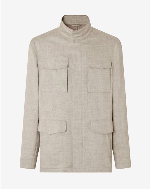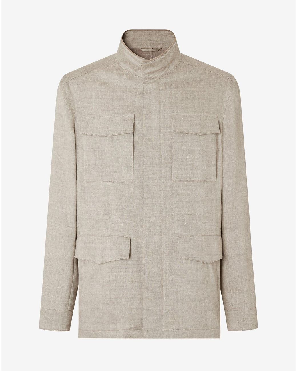 Leggera e funzionale, questa field jacket sabbia in lino e lana stretch è pensata per le mezze stagioni. La costruzione sfoderata e il collo in piedi definiscono un’attitudine disinvolta, con chiusura a pressione nascosta per un davanti pulito. Le tasche applicate al petto e quelle basse con doppio ingresso aggiungono praticità, mentre il dettaglio in vero suede sul fondo manica introduce una nota ricercata. Colore: bianco