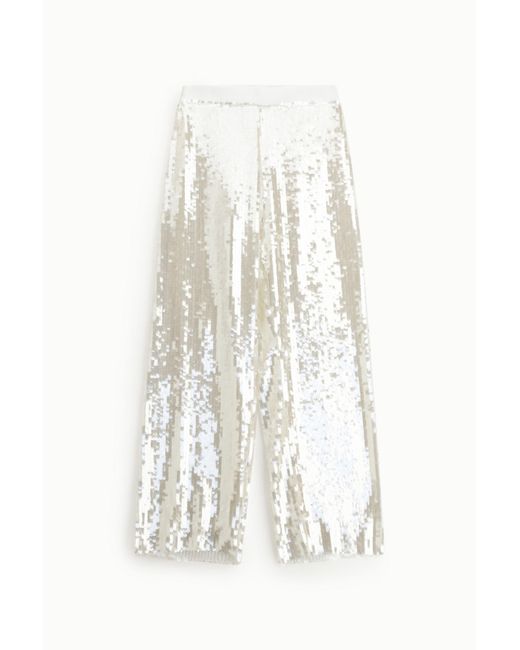 Lasciati conquistare da questi pantaloni palazzo a vita alta, arricchiti da una luminosa pioggia di paillettes che catturano la luce a ogni movimento. La linea ampia dona grande comodità e un tocco di ricercatezza, perfetta per rendere speciale anche la serata più semplice. Immaginali con sandali o tacchi per distinguerti con naturalezza. Colore: bianco