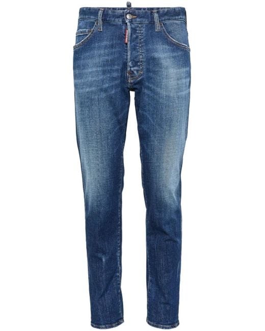 Blu cotone denim con effetto schiarito effetto sbiadito effetto vissuto nelle cosce mini targhetta con logo applicazione posteriore con logo cuciture a contrasto vita media chiusura frontale con bottoni e zip passanti design classico a cinque tasche taglio skinny Size: 44. Gender: Male. Material:cotone/elastam/poliestere.