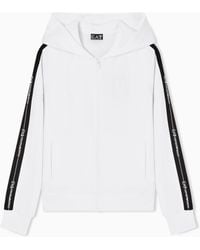 Vai su EA7Felpa provvista di pratico cappuccio e chiusura con zip, realizzata in jersey di cotone. Il modello è personalizzato dal dettaglio logo tape lungo i profili delle maniche, e logo EA7 in tono sul