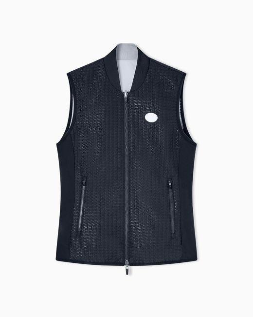 Gilet con leggera imbottitura e trattamento anti vento e water repellent, realizzato in tessuto tecnico VENTUS7 che grazie all'elevata traspirabilità del filato, assicura una ventilazione ottimale per tutta la durata dell'allenamento, garantendo una temperatura costante. Il modello reversibile, presenta collo baseball, chiusura frontale con zip, due tasche applicate con aletta e personalizzazione con logo EA7 a contrasto sul petto. Il capo è parte della proposta Golf Pro, una collezione dedicata agli appassionati che prediligono un look tecnico ma ricercato al tempo stesso. Colore: blu