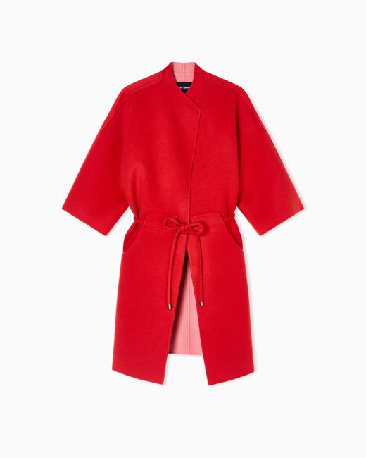 Cappotto realizzato lana vergine double, dai volumi morbidi e avvolgenti. Il modello, con collo montante e maniche a tre quarti, è chiuso in vita da una cintura in tubolare e si distingue per la particolarità dell'interno a contrasto. Una proposta dalla silhouette pulita e sofisticata, perfetto per adattarsi con disinvoltura a diverse occasioni. Il capo è parte della selezione Holiday, che spazia dai toni più caldi a quelli più freschi con sfumature di rosso corallo e grigi, colori che creano una palette raffinata e senza tempo. La collezione propone forme fluide e tessuti morbidi per un tocco di modernità che non rinuncia mai alla classicità e all'eleganza. Colore: rosso