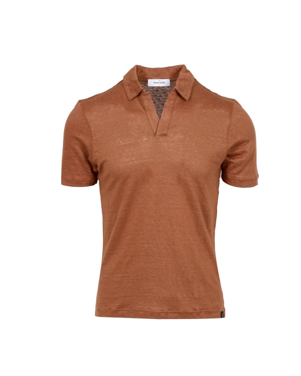 Eleva il tuo stile casual con questa polo in lino Gran Sasso. Realizzata in Italia, presenta una tessuto testurizzato con finitura semi-lucida, classico colletto a punta, scollo a V, maniche corte, patch logo sul fondo davanti e orlo dritto con spacchi ai lati. Il taglio regolare assicura una vestibilità comoda. Colore: marrone
