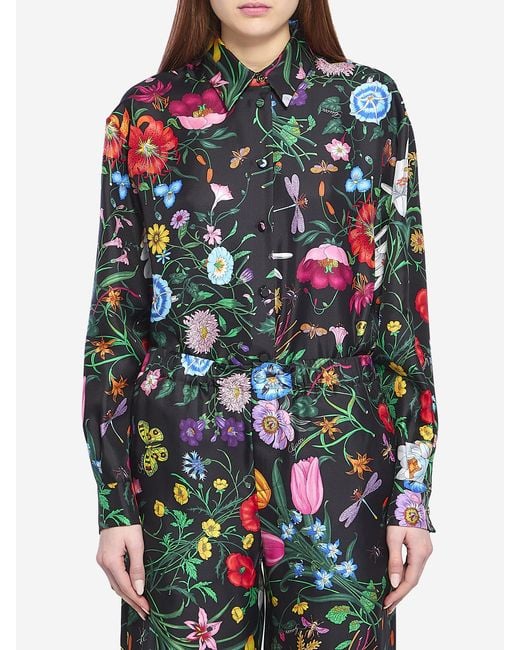 Camicia in twill di seta nera con stampa multicolor Gucci Flora all over. Presenta colletto a punta, chiusura con bottoni rivestiti sul davanti e dettaglio bottone GG in metallo, maniche lunghe, polsini con bottone GG in metallo. Vestibilità comoda. Colore: blu