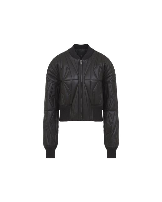 Moncler X Rick Owens Dark Gray Geocamo Cropped Jacket. Dark Gray nappa lambskin leather, waist length with long sleeves and a regular fit. Center front metal zipper with placket and top snap, a wool blend rib knit collar, cuffs and wide waistband. Rounded fit with a dropped armhole and is Geocamo quilted and embroidered all over, creating a padding effect. Moncler + Rick Owens embroidered logo patch on the lower left arm. Recycled ultra-lightweight polyester lining and interior metal zippered pockets. Colore: Grey Composizione: Lamb Skin, 100%LAMB LEATHER Made in: Italy Codice articolo: MU01F1A11M8116828DARK