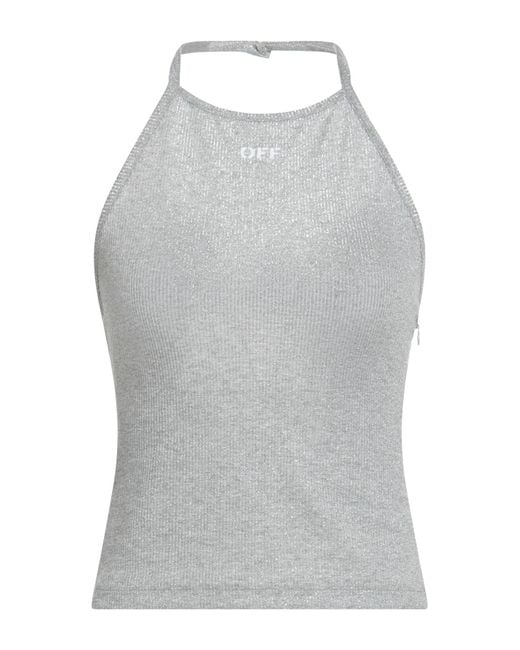 OFF-WHITE™. crop top, jersey a coste, metallizzato, tessuto elasticizzato, tinta unita, brand logo, stampa, scollatura all’americana, senza maniche, chiusura con bottoni automatici, lavare in lavatrice o a secco, non candeggiare, non asciugare in asciugatrice. 76% Viscosa, 11% Poliammide, 11% Fibra di metallo, 2% Elastan. Colore: grigio