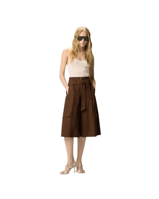 I bermuda Pinko Patricia sono bermuda lunghi in stile cargo, realizzati in un twill di cotone spesso e fluido. Uniscono pinces frontali sartoriali e una cintura in tessuto abbinato con doppia fibbia tono su tono a tasche utility, per un look versatile, casual o smart-casual. Caratteristiche principali: Marrone | Marrone | Cotone | Foderati per un maggiore comfort | Cintura in tessuto abbinato con doppia fibbia tono su tono | Tasche laterali | Tasche posteriori a filetto | Tasche con patta e bottone lungo le gambe | Vita elasticizzata sui lati | Fodera interna per il comfort | Raffinate pinces frontali | Texture twill | Tasche in stile cargo | Lunghezza bermuda lunga | Silhouette ampia e fluida a gamba larga | Dimensioni e vestibilità: Vita alta | Vestibilità rilassata | Lunghezza 7/8 | Composizione e cura: 100% cotone (tessuto esterno) | 100% poliestere (fodera corpo) | Lavare a mano a freddo. Non candeggiare. Non asciugare in asciugatrice. Asciugare appeso. Stirare a max 110°C. Non lavare a secco.