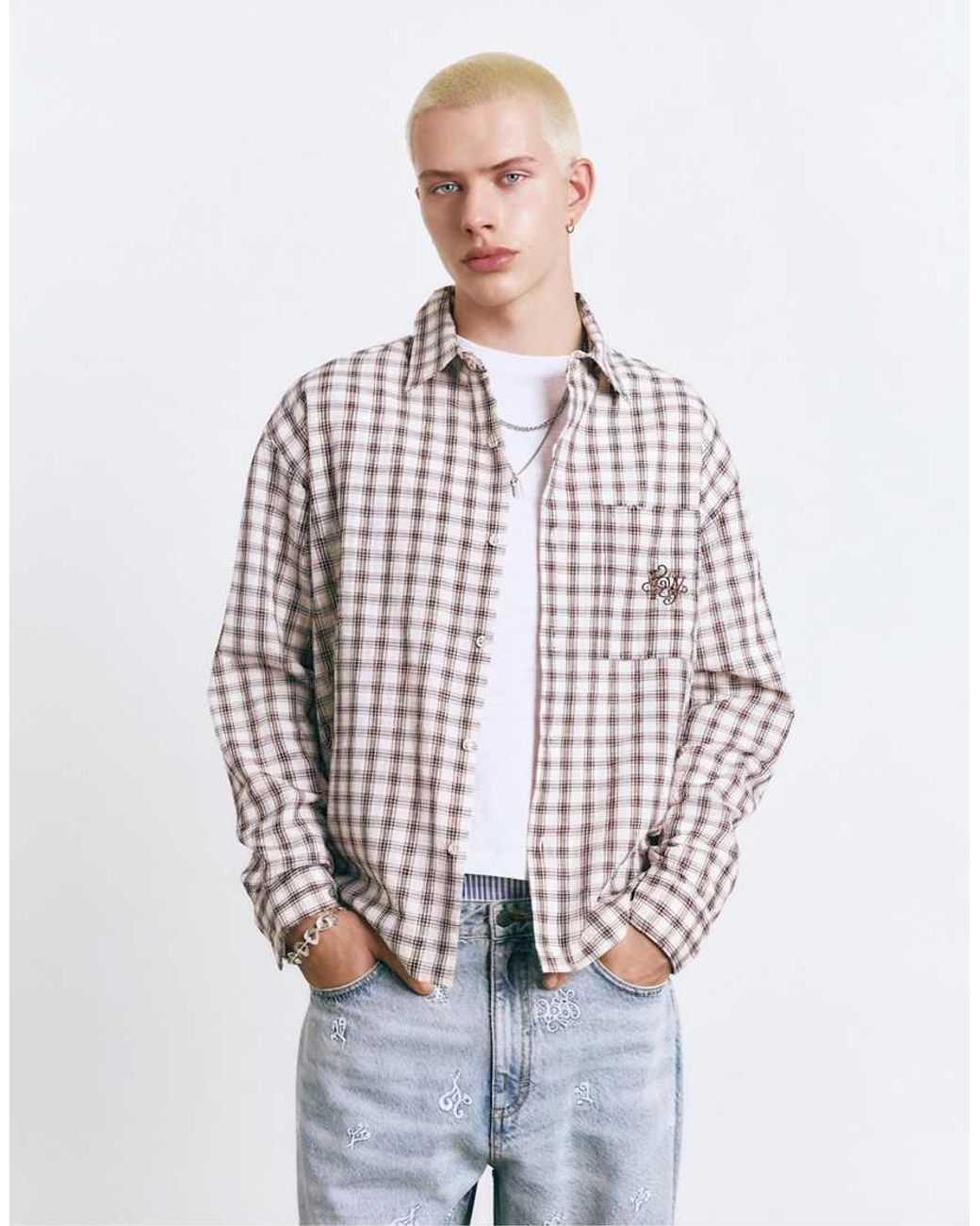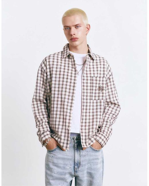 Camicie di Pull&Bear Motivo a quadri Colletto ampio Chiusura con bottoni Maniche lunghe Tasca sul petto Dettaglio ricamato Regular fit Colore: bianco