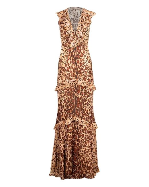 Beige e marrone stampa ghepardo dettaglio con ruches con balze senza maniche scollo a V lunghezza maxi Size: 2. Gender: Female. Material:rayon. Colore: neutro