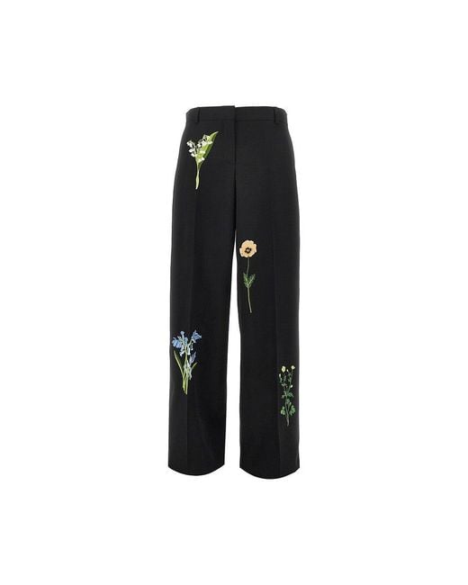 Pantalone realizzato in twill di lana con fiori ricamati, caratterizzato dalla silhouette rilassata con vita scesa e gamba dritta. Passanti per cintura, patta con zip e chiusura con ganci e bottone a scomparsa. Tasche laterali alla francese e una tasca a filetto sul retro. Colore: nero