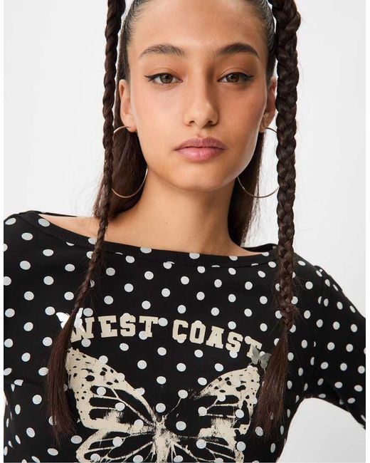 T-Shirt Nera A Pois Con Scollo A Barchetta E Stampa da donna di colore nero