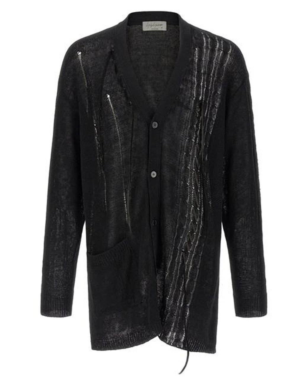 Cardigan in maglia misto lino e cotone, scollo a V, lavorazione multipunto a trecce verticali,dettaglio intarsio laccetti in pelle, chiusura frontale con bottoni, maniche lunghe con polsini. Colore: nero