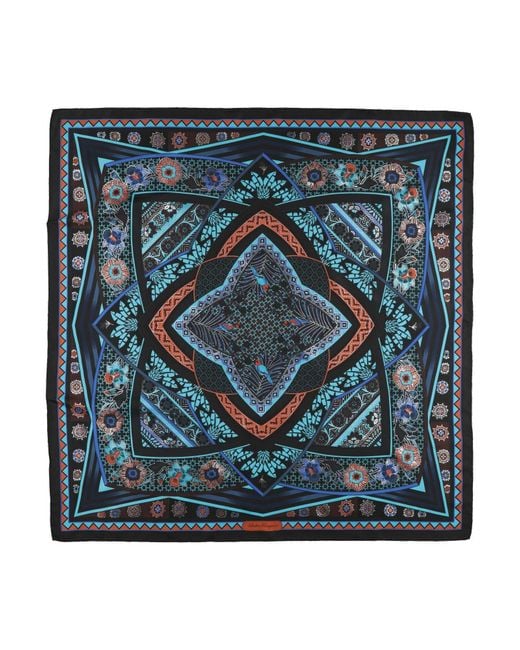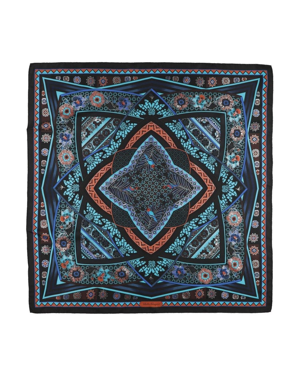 FERRAGAMO. foulard, twill, metallizzato, fantasia floreale, brand logo, lavare a secco, non candeggiare, non asciugare in asciugatrice. 100% Seta. Colore: blu