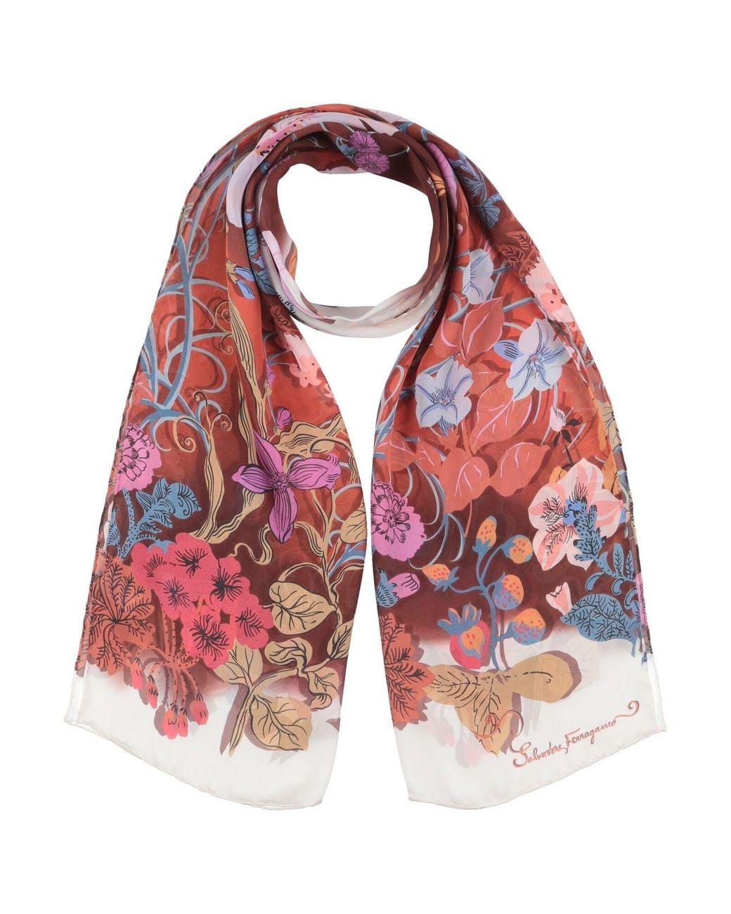 FERRAGAMO. sciarpa, chiffon, fantasia floreale, brand logo, lavare a secco, non candeggiare, non asciugare in asciugatrice. 100% Seta. Colore: rosso