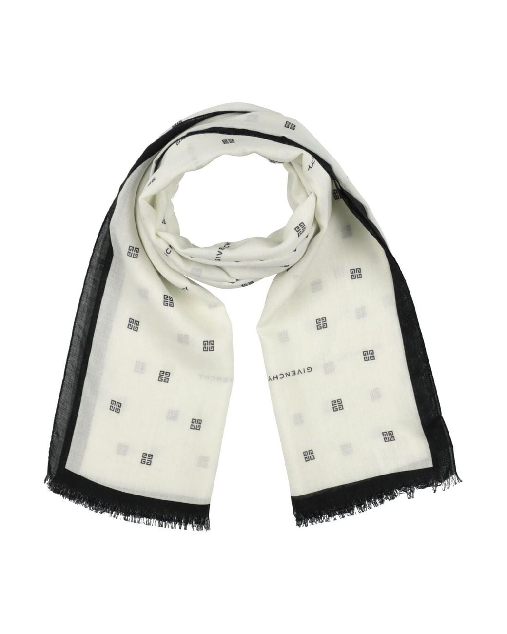 GIVENCHY. sciarpa, garza, fantasia logo, brand logo, lavare a secco, non candeggiare, non asciugare in asciugatrice. 65% Cachemire, 35% Seta. Colore: bianco