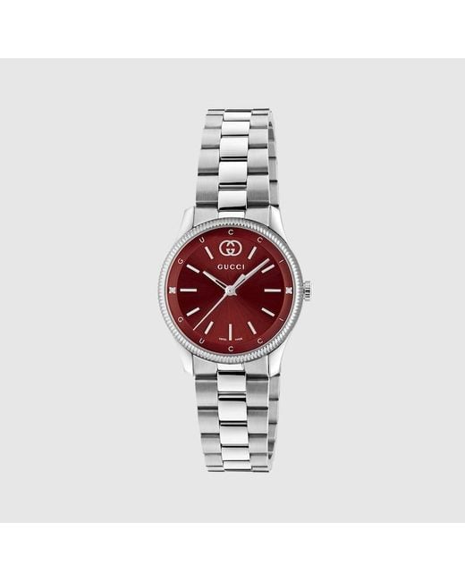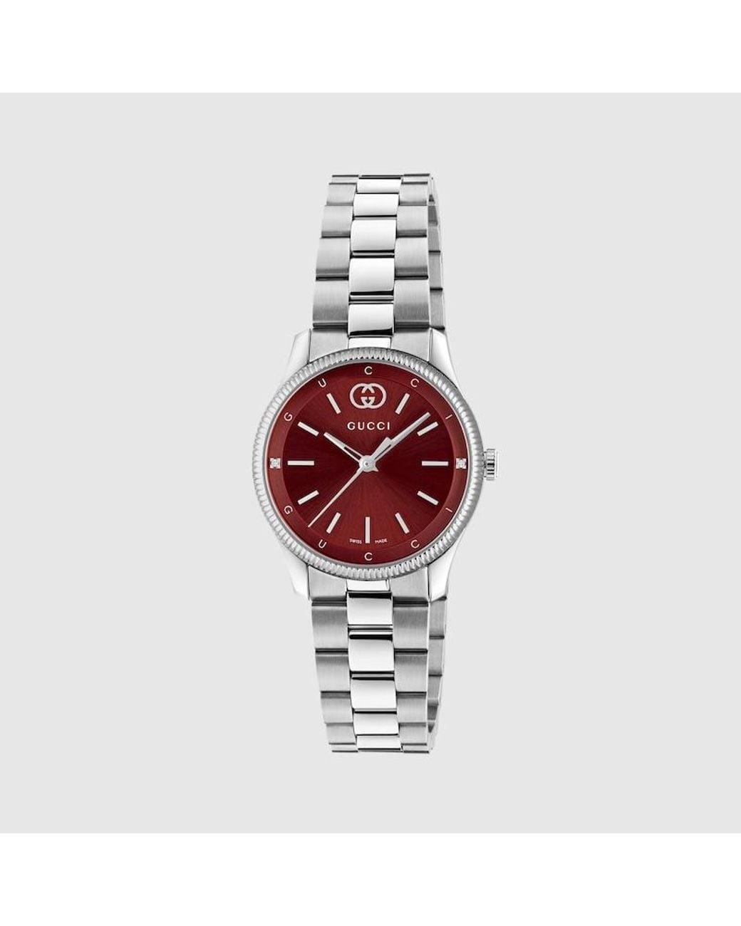 Per le ultime collezioni, la linea G-Timeless è rivisitata in una palette cromatica dalle tonalità vivaci che mettono in risalto i motivi emblematici della Maison. Alimentato da un movimento al quarzo e dotato di cinturino in acciaio inox, questo orologio presenta un quadrante color bordeaux. Cassa in acciaio inox da 29 mm, Quadrante bordeaux con due diamanti, dettaglio Incrocio GG e scritta Gucci, Vetro zaffiro trattato antiriflesso, Cinturino in acciaio inox, I certificati di garanzia per gli orologi Gucci acquistati dopo il 1° marzo 2022 sono disponibili in esclusiva online. Scarica il certificato all'indirizzo https://watchwarranty.gucci.com aggiungendo il numero di serie inciso sul retro dell'orologio. , Movimento al quarzo, 5 ATM (50 metri), YA1265069, Misura polso: da 120 mm a 195 mm, Swiss Made Colore: rosso