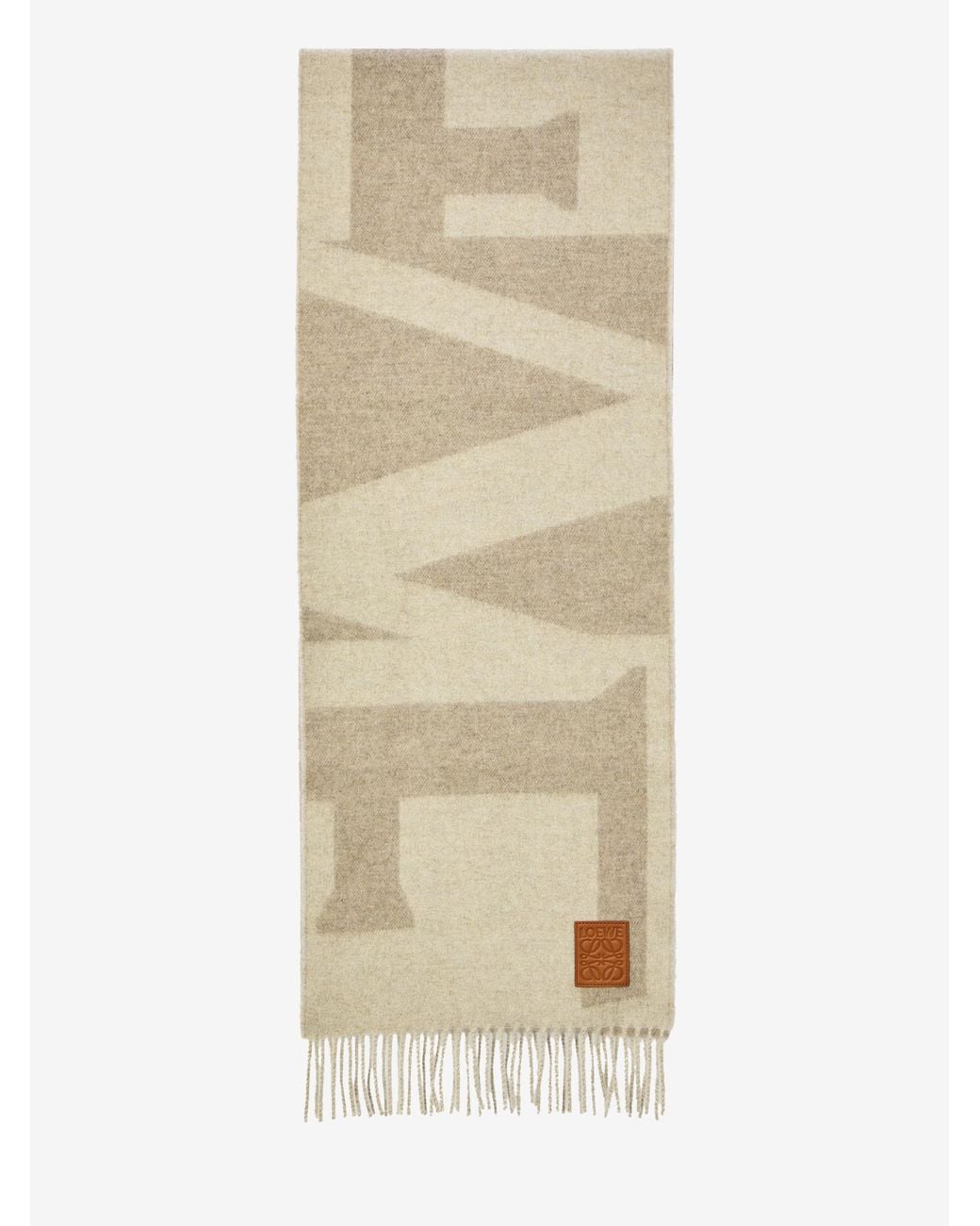 Sciarpa in leggero cashmere con moitivo cut-off LOEWE bicolore grigio Light Grey e Stone. Presenta applicazione in pelle con motivo Anagram LOEWE goffrato sull'angolo e bordi sfrangiati. Dimensioni: 30 x 160 cm Colore: neutro