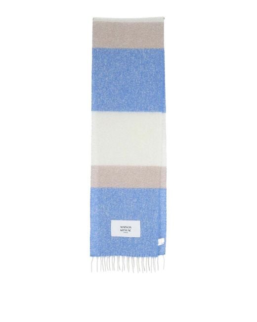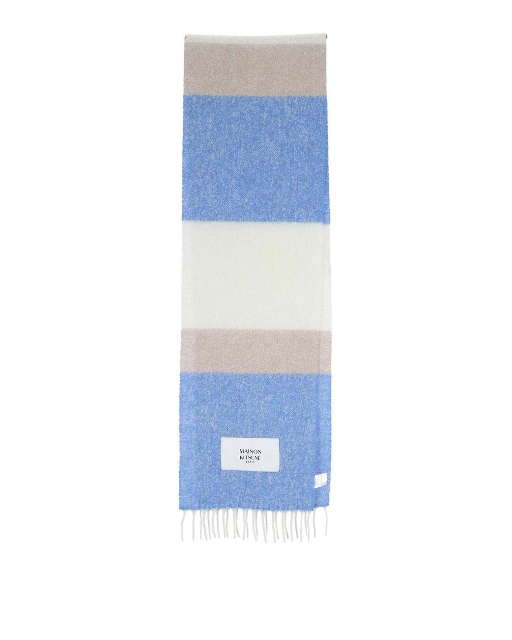 Sciarpa in misto alpaca maison kitsun, multicolor, design rettangolare, motivo a righe, etichetta logo ricamata fronte, frange su fondo. Colore: blu