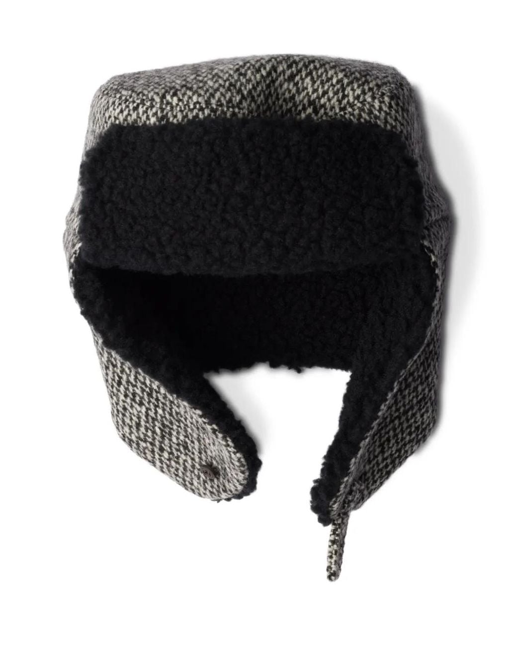 Bianco e nero fantasia pied-de-poule paraorecchie in pile chiusura con bottoni logo a triangolo Size: L. Gender: Male. Material:lana vergine/tessuto. Colore: nero
